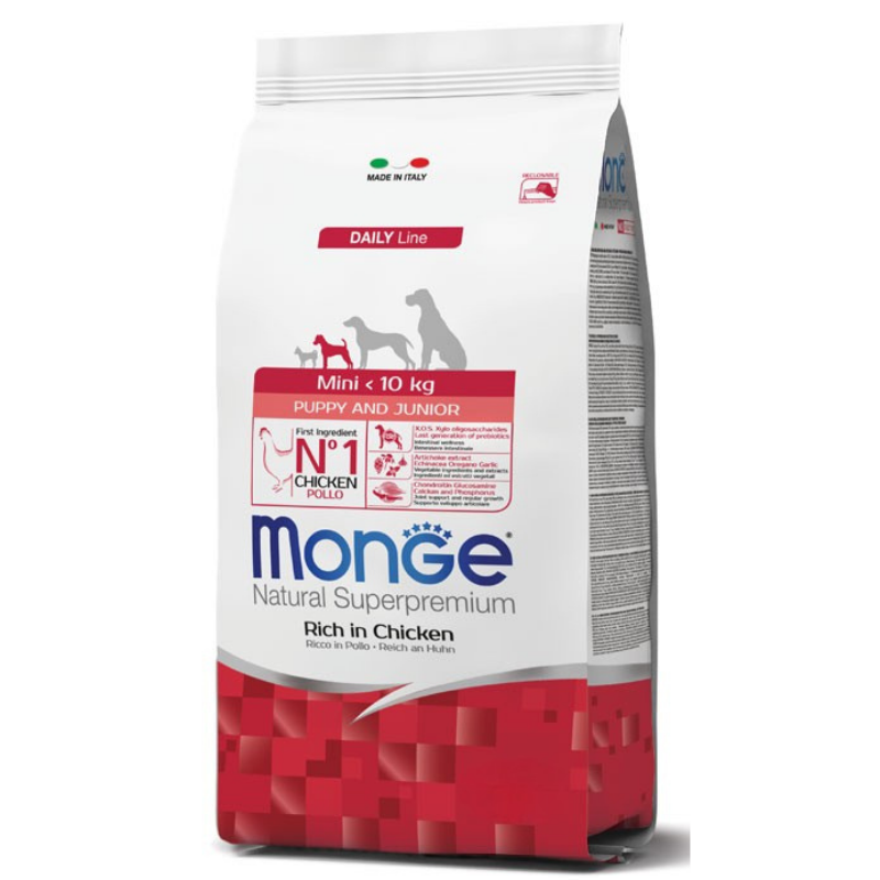 Monge Natural Superpremium Mini Puppy and Junior Rich in Chicken kiçik ölçülü itlər (<10 kq) üçün tam ev heyvanı yemidir. Made in Italy tədqiqatı nəticəsində yüksək keyfiyyətli qida maddələrinin olması sayəsində itinizin sağlamlığı üçün xüsusi olaraq hazırlanmışdır. Birinci tərkib hissəsi toyuqdur və tərkibi təzə ətin daxil olması səbəbindən həzm və dadlı olması ilə xarakterizə olunur. Resept bağırsaq sağlamlığını dəstəkləyən prebiyotiklər olan yeni nəsil XOS (Xylo-oligosaccharide) ilə təkmilləşdirilmişdir. Kompozisiya həmçinin artikulyasiyanın inkişafını və balanın sümüklərinin və oynaqlarının müntəzəm böyüməsi üçün balanslaşdırılmış kalsium/fosfor nisbətini dəstəkləmək üçün qlükozamin və xondroitin sulfatdan ibarətdir. Əlavə boyalar və süni konservantlar yoxdur.