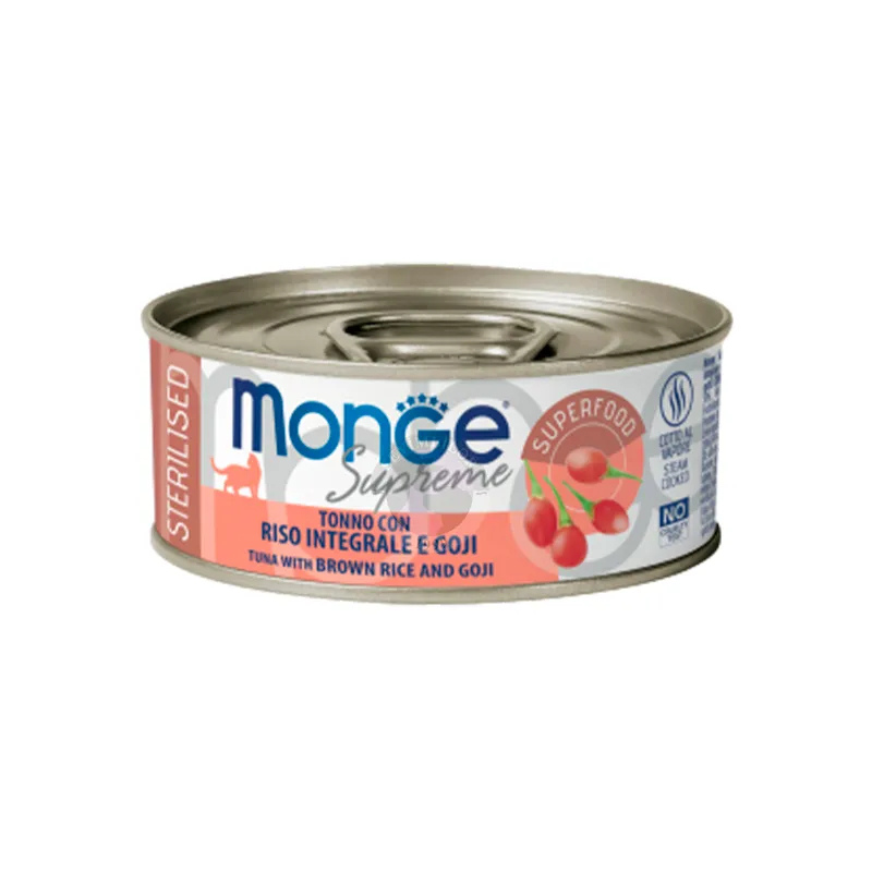 Monge Natural Superpremium Supreme Cat Sterilizasiya olunmuş Tuna, qəhvəyi düyü və qoji giləmeyvələri ilə yetkin sterilizasiya olunmuş pişiklər üçün balanslı, tamamlayıcı bir qidadır . Bütün qida dəyərini qoruyan və asanlıqla həzm olunan buxarda bişmiş ətdən hazırlanmış ləzzətli fileto.