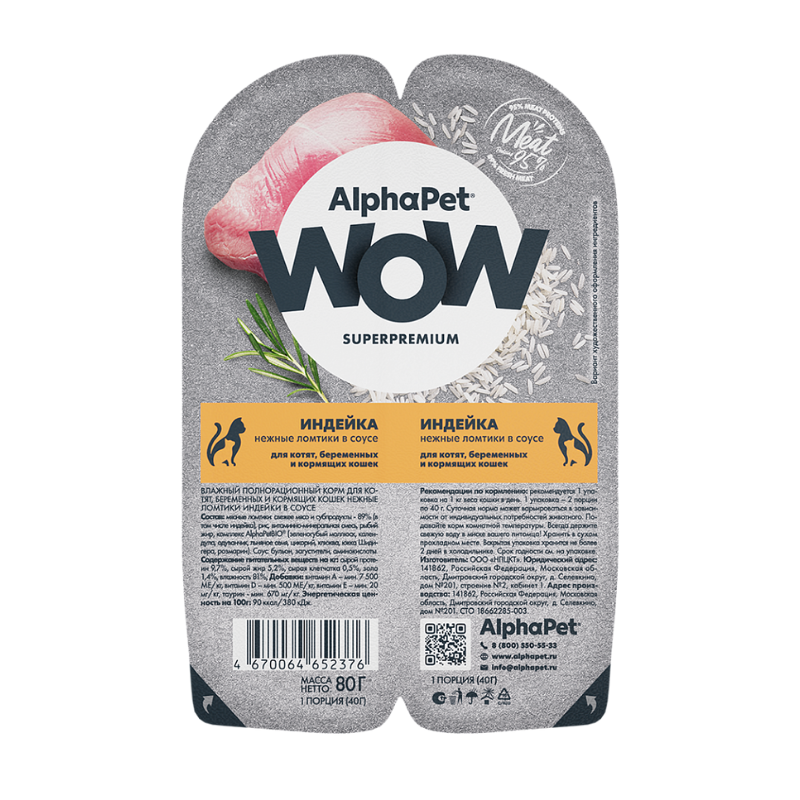 AlphaPet WOW Superpremium / Pişik balaları, hamilə və süd verən pişiklər üçün tam yaş qida: sousda zərif hinduşka dilimləri.
