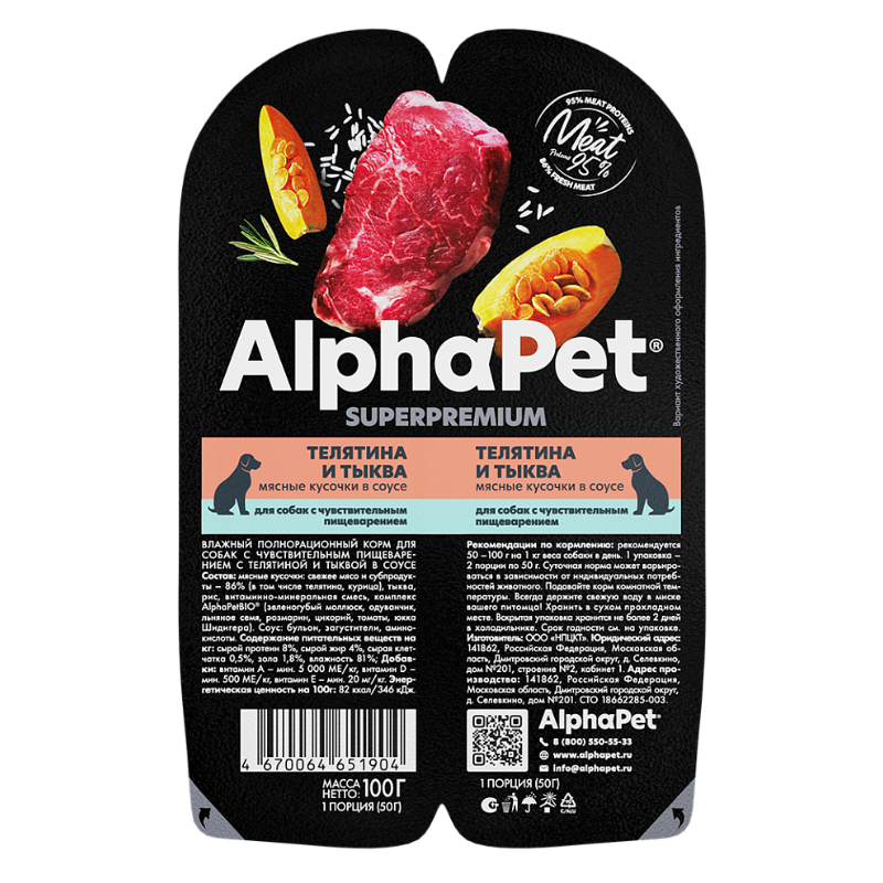 AlphaPet Superpremium / Sousda dana əti və balqabaq ilə həssas həzmli itlər üçün tam yaş tam yem.
