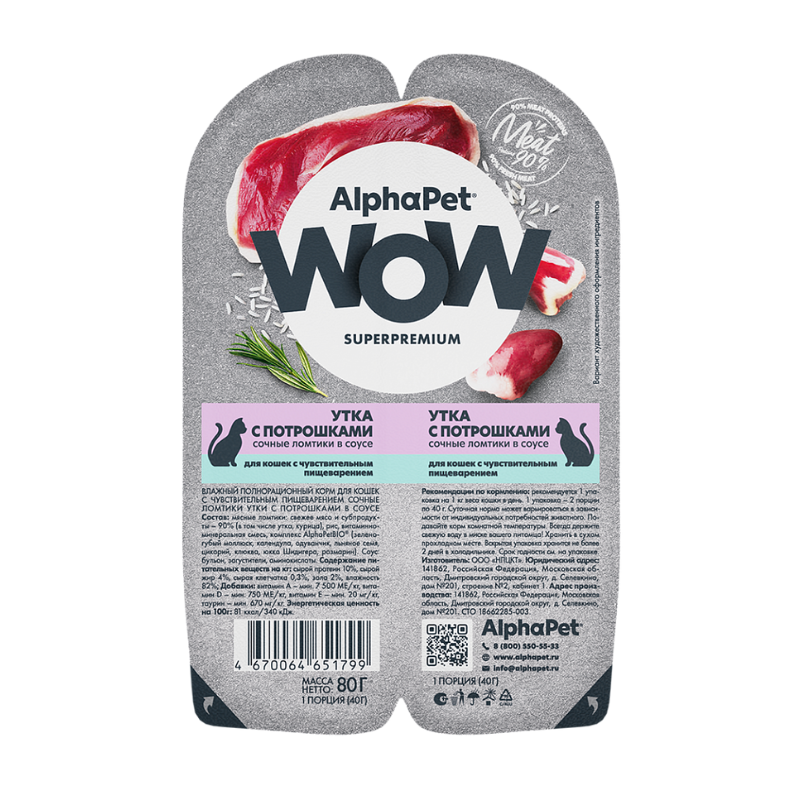 Həssas həzmi olan pişiklər üçün AlphaPet WOW Superpremium / Yaş tam yem: sousda şirəli ördək dilimləri