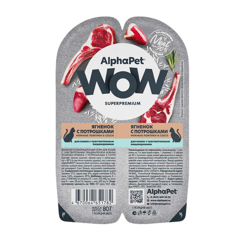 Həssas həzmi olan pişiklər üçün AlphaPet WOW Superpremium / Yaş tam yem: sousda quzu ətinin incə dilimləri.