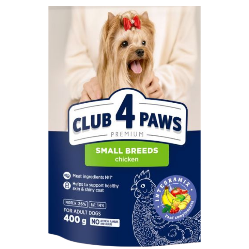 Club 4 Paws premium quru qidası əsasən ətdən ibarətdir və tərkibində yüksək toyuq əti (29%) olan balanslaşdırılmış formulaya malikdir. Çəkisi 10 kq-a qədər olan və 1 yaşdan yuxarı kiçik cins itlər üçün mükəmməldir. Qida sağlam dəri və parlaq palto üçün Omega 3 + Omega 6 kompleksi ilə zənginləşdirilmişdir.