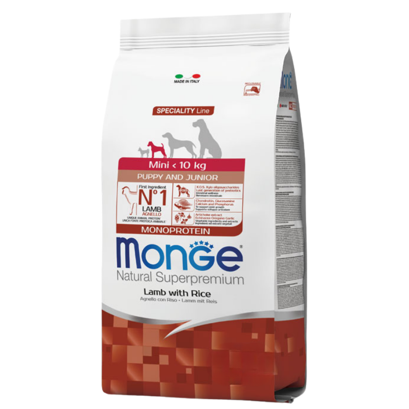 Monge Natural Superpremium Mini Puppy and Junior Monoprotein Lamb with Rice mini ölçülü itlər üçün tam yemdir. Made in Italy yüksək keyfiyyətli qida maddələrinin tədqiqatı tərəfindən itinizin sağlamlığı üçün xüsusi olaraq hazırlanmışdır. Tək heyvan zülal mənbəyi ilə hazırlanmış məhsul, birinci inqrediyent quzu ətidir və təzə ətin daxil olması səbəbindən həzm qabiliyyəti və dadlılığı ilə xarakterizə olunur. Resept həmçinin bağırsaq sağlamlığını dəstəkləyən prebiyotiklər olan yeni nəsil XOS (Xylo-oligosaccharide) ilə gücləndirilmişdir. Bundan əlavə, formulada artikulyasiyanın inkişafını dəstəkləmək üçün qlükozamin və xondroitin sulfat və balanın sümüklərinin və oynaqlarının müntəzəm böyüməsi üçün balanslaşdırılmış kalsium/fosfor nisbəti var. Əlavə boyalar və süni konservantlar yoxdur.
