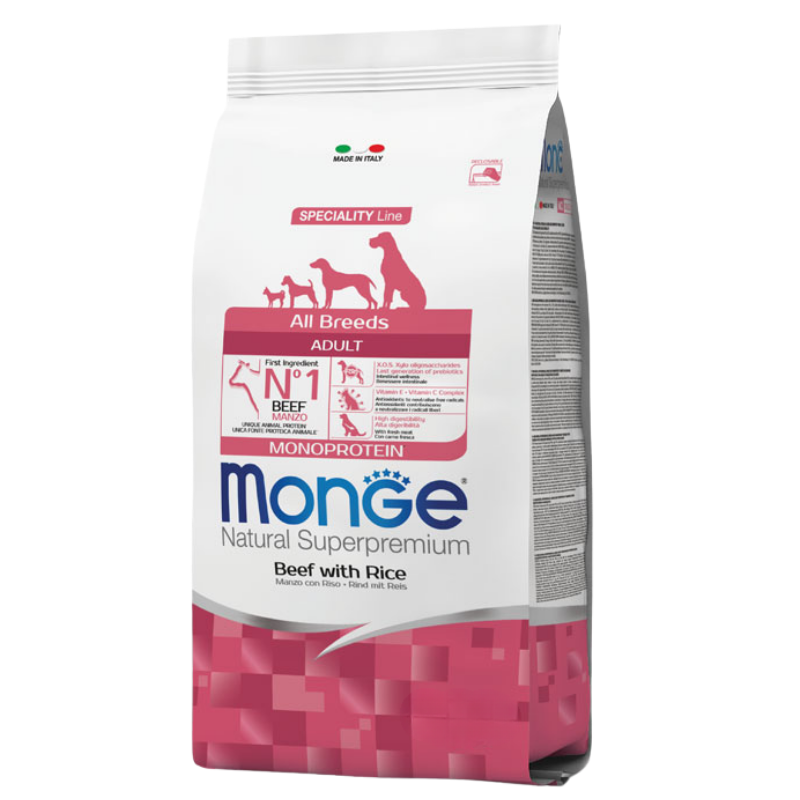 Monge Natural Superpremium Bütün cinslər Yetkin Monoprotein Düyü ilə Mal əti hər ölçüdə yetkin itlər üçün tam yemdir. Made in Italy yüksək keyfiyyətli qida maddələrinin tədqiqatı tərəfindən itinizin sağlamlığı üçün xüsusi olaraq hazırlanmışdır. Tək heyvan zülal mənbəyi ilə hazırlanmış məhsul, ilk tərkib hissəsi mal ətidir və təzə ətin daxil olması səbəbindən həzm oluna bilməsi və dadlılığı ilə xarakterizə olunur. Resept həmçinin bağırsağın sağlamlığını dəstəkləyən prebiyotiklər olan yeni nəsil XOS (Xylo-oligosaccharide) və Echinacea kökü, keklikotilik, sarımsaq və artishok ekstraktı kimi bitki inqrediyentləri və ekstraktları ilə təkmilləşdirilmişdir. Bundan əlavə, formula sərbəst radikalları zərərsizləşdirmək üçün antioksidant Vitamin E və Vitamin C Kompleksini ehtiva edir. Əlavə boyalar və süni konservantlar yoxdur.