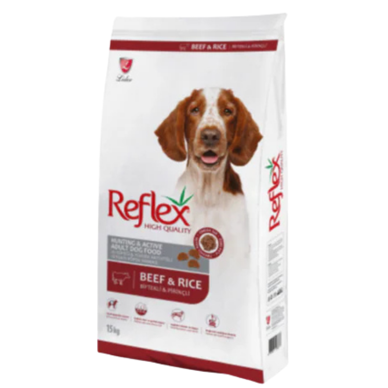 Reflex Adult Dog Hunting & Active yüksək keyfiyyətli mal əti zülalından hazırlanmış, bütün yetkin iri cins və işləyən itlərin gündəlik qidalanma tələblərini yerinə yetirmək üçün it qidalanma mütəxəssisləri tərəfindən diqqətlə hazırlanmış yüksək keyfiyyətli, tam təbii it yemidir.
