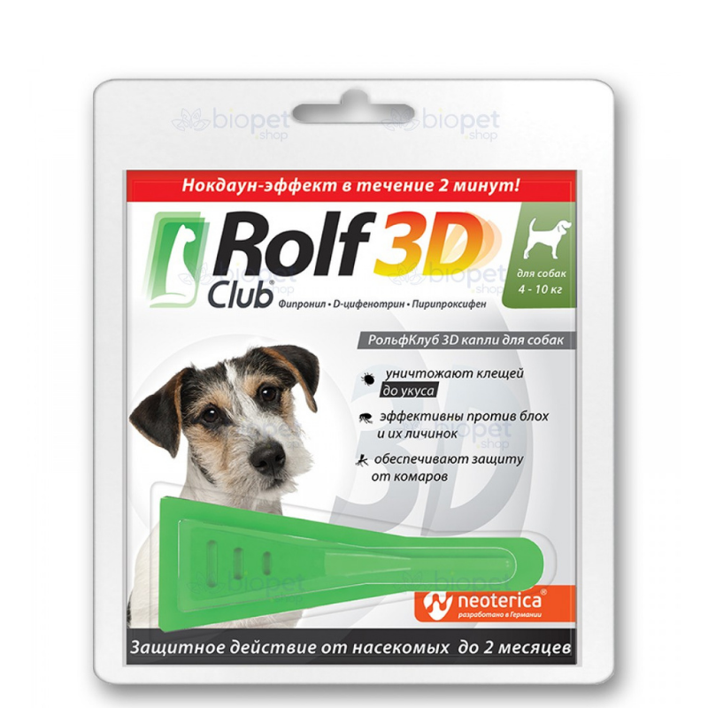 Rolf Club 3D İt üçün birə və gənəyə qarşı damcı. Çəkisi 4-10 kq itlər üçün. Yetkin itlər və 12 həftədən bala itlər üçün entomoz (birə, bit,tükyeyən), otodektoz, sarkoptoz, iksod gənələrində, habelə uçan qansoran həşəratlara qarşı müdafiədə istifadə olunur. Yapışmış gənələr və parazitləşdirici həşəratların ölümü dərmanın tətbiqindən 1-2 saat sonra baş verir.